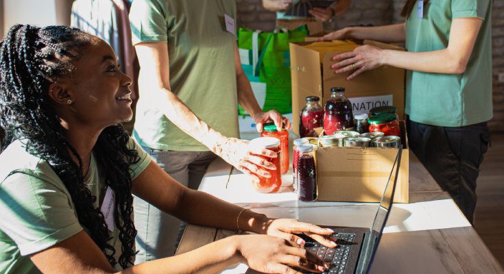 A group of volunteers wearing matching green t-shirts is working in a community charity donation center.