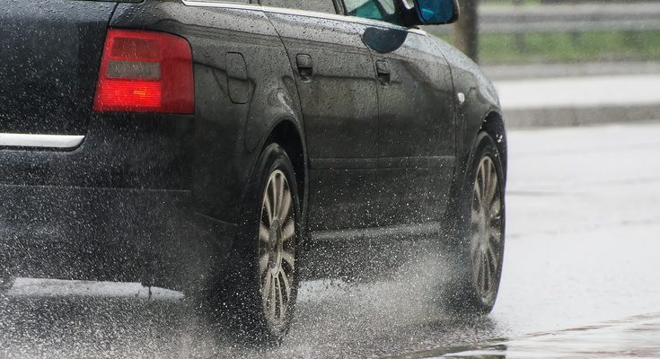 A close-up view shows a black vehicle driving down the road in a rainstorm. The tires are kicking up water.